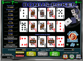 Each 1-hand Video Poker game can be played for $.05, $.25, $.50, $1.00 or $5.00 and you may play from 1 to 5 coins per hand. Depending on the amount of coins played, the game will highlight the payout column in order for there to be no confusion as to how much you are playing for on any particular game.