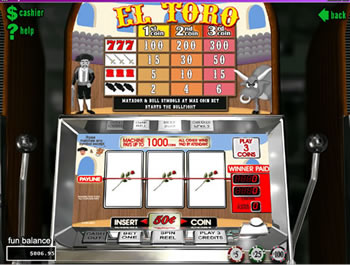 El Toro is a 3-reel slot game, and the pay table is displayed on the machine. It may be played in denominations of $.05, $.25, $.50, $1, and $5.