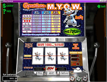 Operation M.Y.O.W. (Make Your Own Win) is a 3-reel slot game where players choose from five different pay tables and each pay table is displayed on the machine. It may be played in denominations of $.05, $.25, $.50, $1, and $5. The theme of this slot machine is feline (cat) with an Asian flair with pay table symbols including Coi, Dragons, Flowers, etc. In addition, cat icons represent the five lucky colors. Each pay table has a distinctive name and lucky color. The names are: Lucky (White), Catman (Purple), Kung Fu Kitty (Yellow), Catzilla (Green), and The King (Pink).